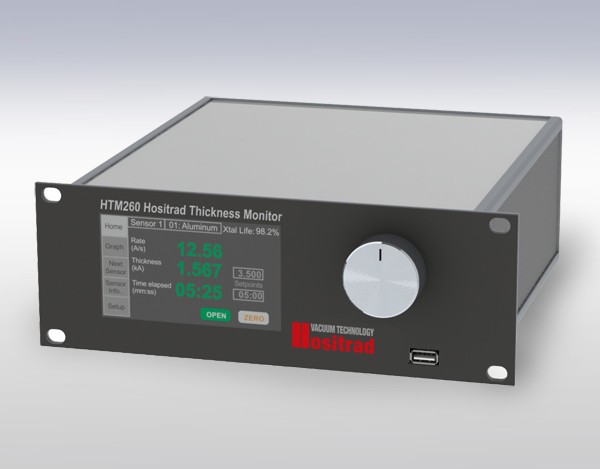 HTM260 Quarz Monitor with Display & Touch ScreenSensor inputs: 2 (operates 2 external oszillators)(optional up to six sensors/oszillators) plus 1x Quartz Monitor HOQM20"High Resolution" Measuring UnitMax. Resolution: 0,01 Hz @ 10 Hz (readings/s)Number of Single Measurements per sec.:0.5, 1, 2, 4, 10 Hz adjustableMeasurement filtering: 1-20 samples with weightingInterface: RS232, Ethernet IP; ModBUS protocol +Inficon SQM160 protocol *Analog outputs: 6, programmableDigital inputs / outputs: 4 inputs;4 Relay outputsSupply voltage: 100-240 VAC 50/60 HzDimensions: 1/2 19 " Rack, 2 HEWeight: 0.200 kg* with future firmware updatesPlease order required external oscillator separately